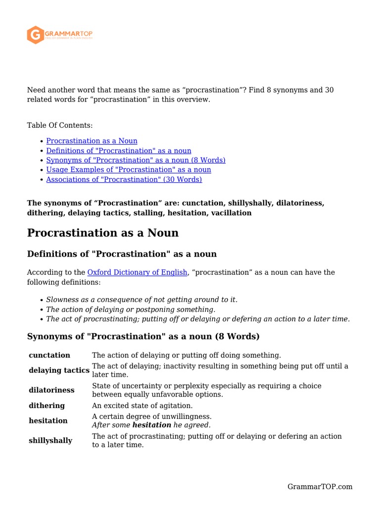 Find 144 different ways to say procrastination, along with antonyms, related words, and example sentences at thesaurus.com. Delay, avoidance, uncertainty, waiting, indecisiveness, hesitation, reluctance, doubt; Find 383 synonyms for procrastination and other similar words that you can use instead based on 5 separate contexts from our thesaurus. Click on any word or phrase to go to its thesaurus page. Or,.