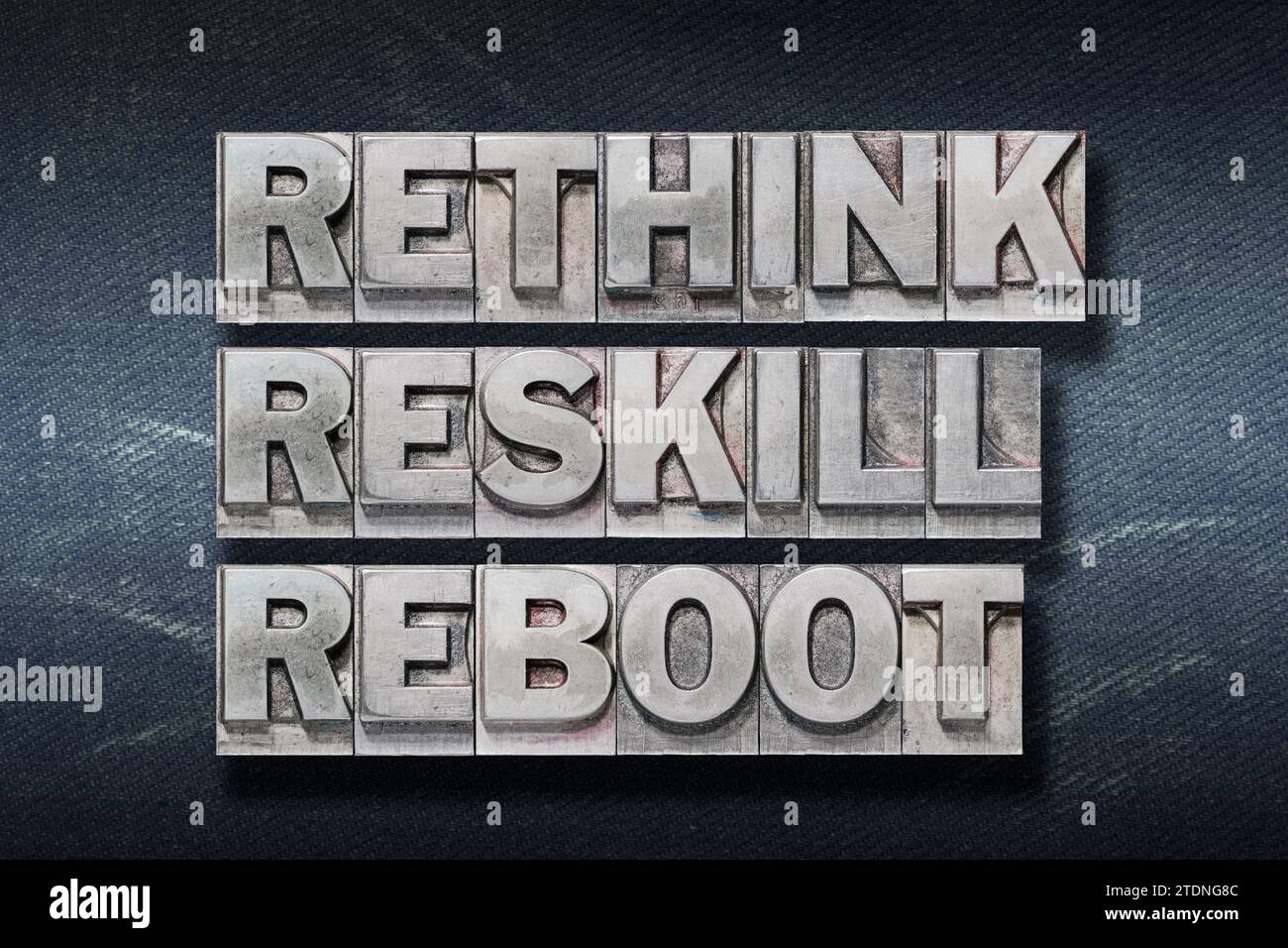 rethink, reskill, reboot words made from metallic letterpress on dark