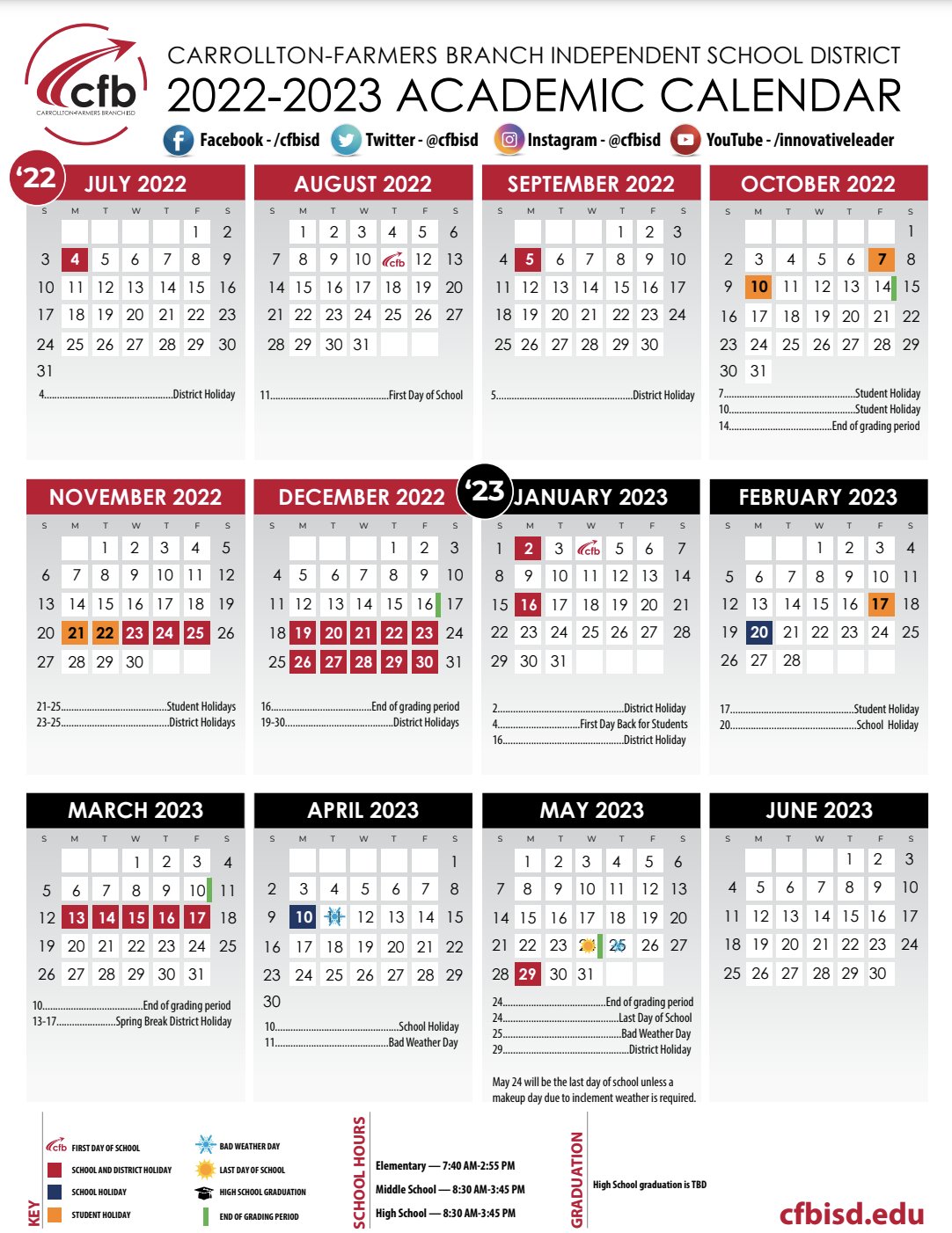 Carrollton Farmers Branch Isd Calendar - The school calendar provided on this page is taken from the official. Key first day of school school and district holiday high school graduation last day of school bad weather day student holiday parent conference.