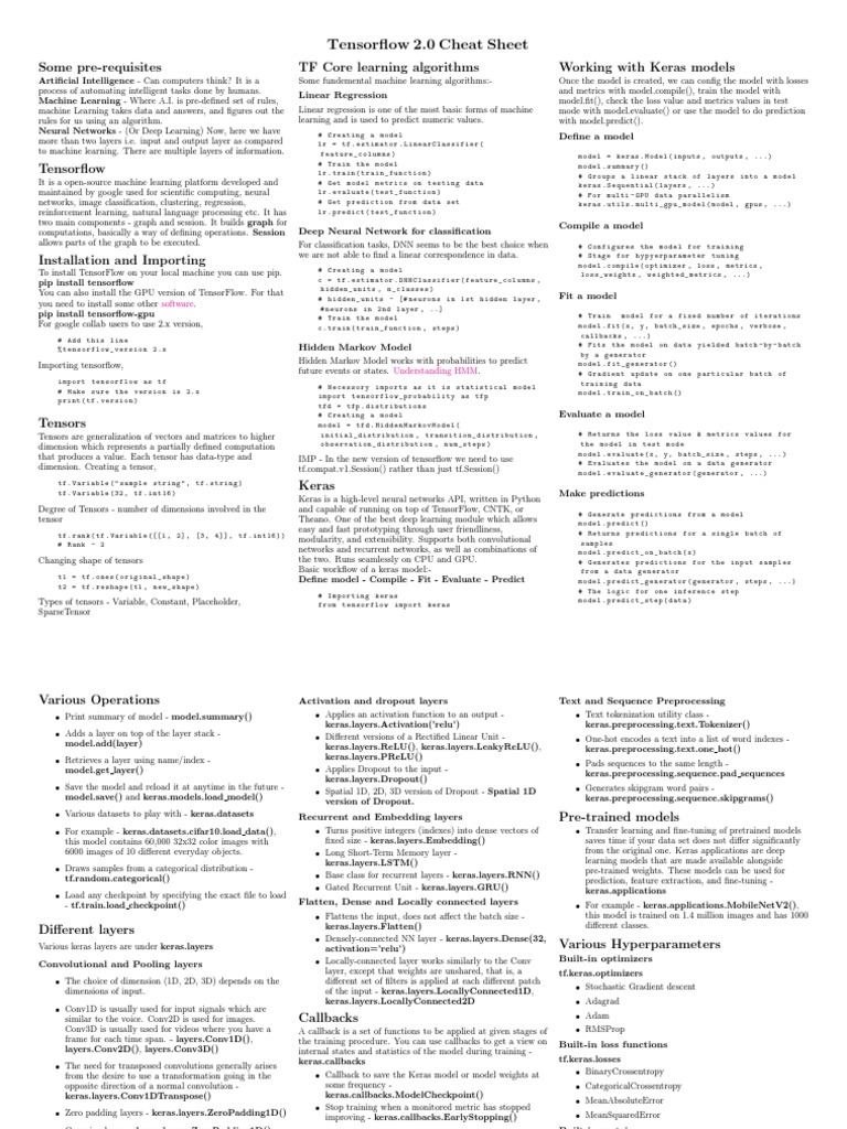 Tensorflow 2 0 Cheat Sheet PDF Machine Learning Deep Learning