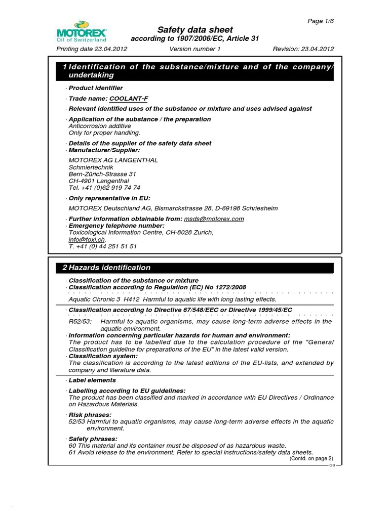 For specific application advice see appropriate technical data sheet or consult our company representative. Identification product identifier yellow concentrated antifreeze/coolant other means of identification fir no. Move out of dangerous area. Heavy duty coolant restrictions on use: Significant laboratory data with possible relevance to human health: