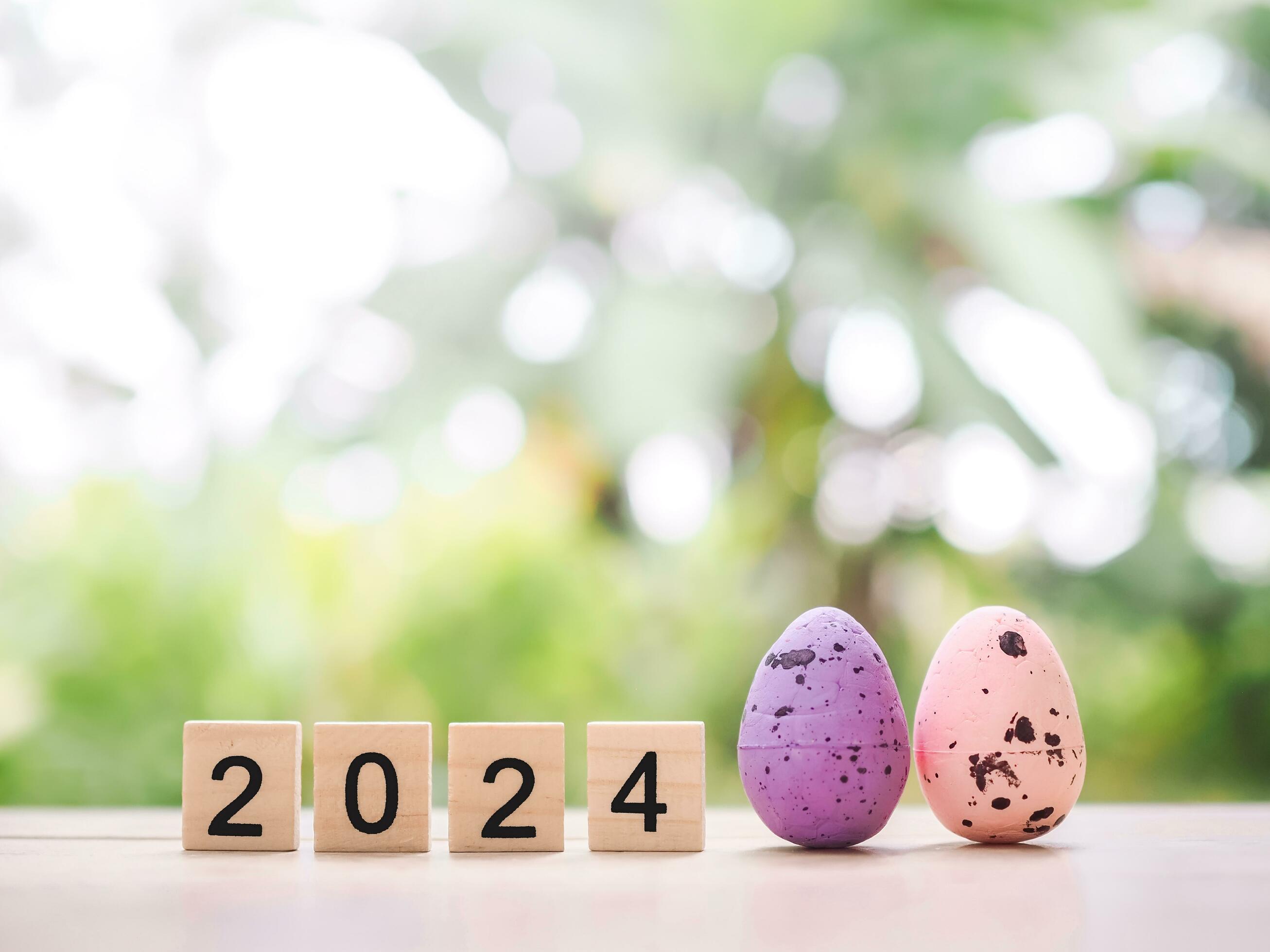 Easter eggs and wooden block with number 2024 for EASTER DAY in new
