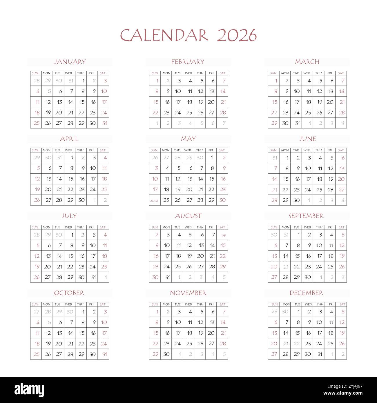 2026 calendar planner. Corporate week. Template layout, 12 months