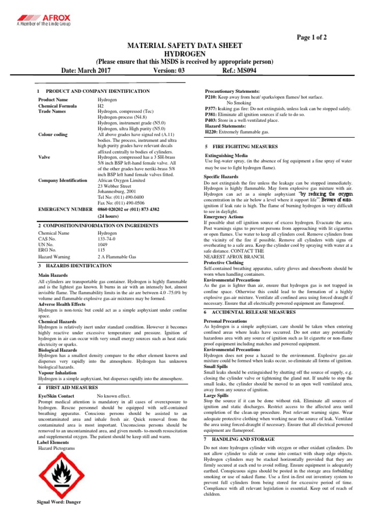 Material Safety Data Sheet Hydrogen (Please Ensure That This MSDS Is