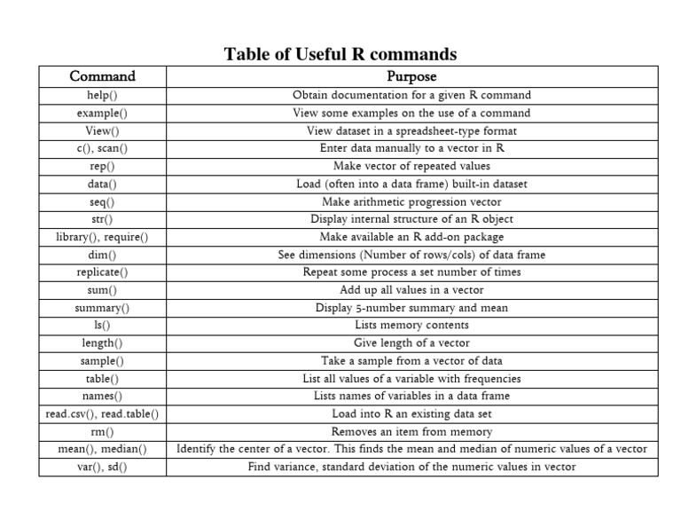 A short list of the most useful r commands a summary of the most important commands with minimal examples. This cheat sheet provides a quick reference for essential r programming commands, helping you perform data manipulation, visualization, and statistical analysis with confidence. See the relevant part of the guide for better examples. On this page you will find a collection.