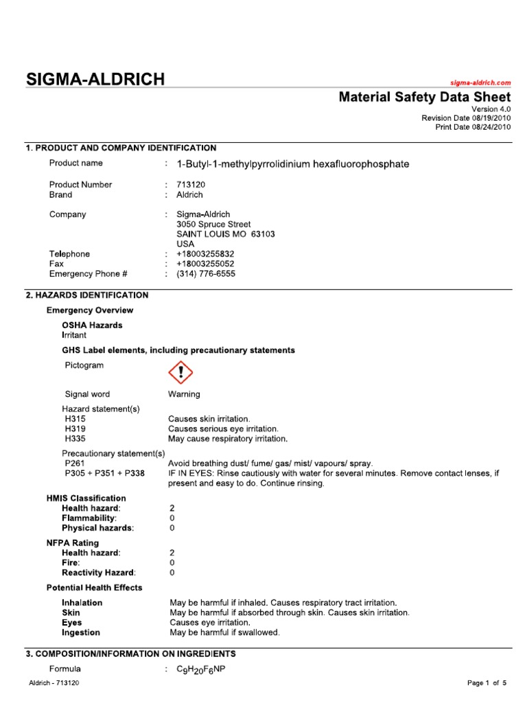 SIGMAALDRICH MATERIAL SAFETY DATA SHEET Date Printed